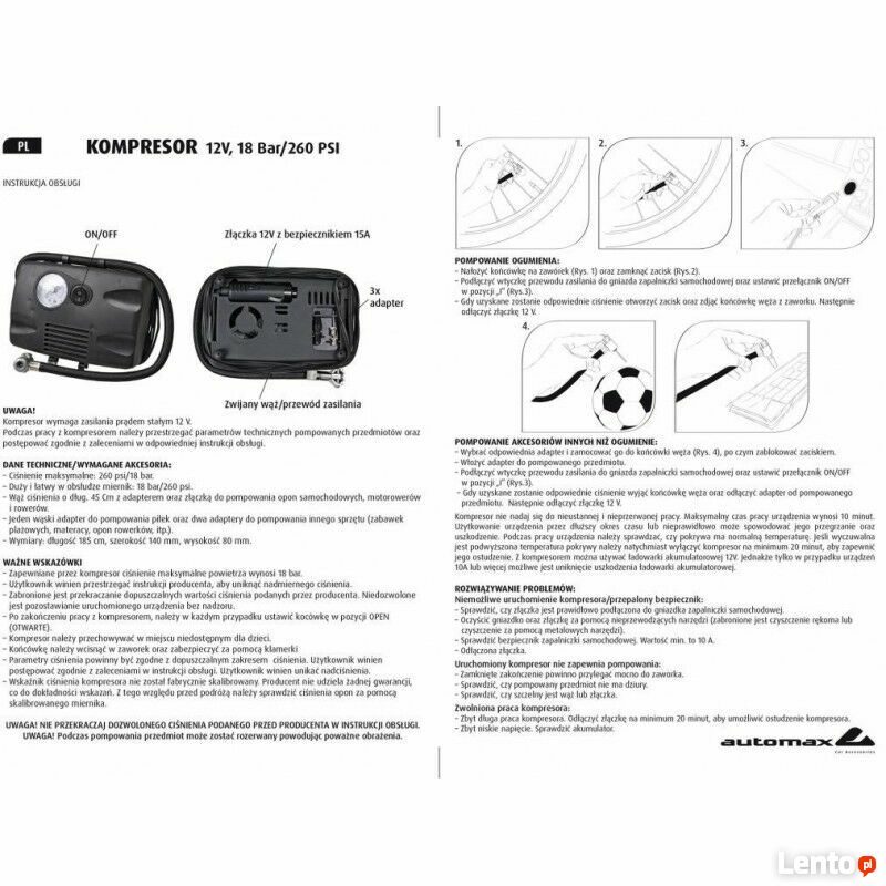 Pompka elektryczna do pompowania kół 7212 kompresor z ciśnieniomierzem 260 psi 18 bar zasilanie + 12 V. + 3 końcówki + torba tekstylna. Możliwa jest wysyłka kurierem, koszt wysyłki 18 zł za pobraniem ,przedpłata przelew 14 zł.Brak możliwości kontaktu przez formularz z ogłoszeniodawcą, ponieważ to ogłoszenie jest archiwalne.